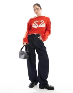 Miss Selfridge Blanket Stitch Swan Heart Jumper In Red For Women