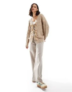 Miss Selfridge Cable Longerline Cardigan With Velvet Bow Detail In Camel For Women