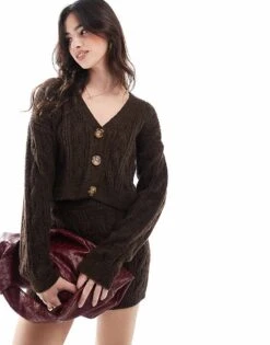 Miss Selfridge Cosy Knit Rib V Neck Faux Pearl Button Detail Long Sleeve Top In Chocolate For Women