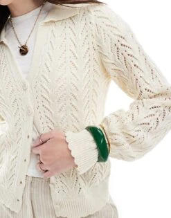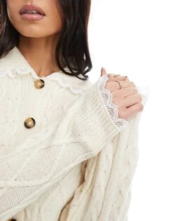 Miss Selfridge Cable Knit Lace Collar Cardigan In Cream For Women