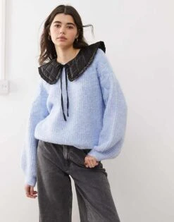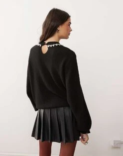 Miss Selfridge Faux Pearl And Diamante Neck Trim Cable Knit Jumper In Black For Women