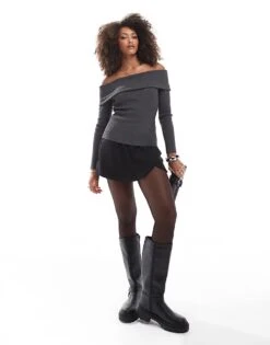 Miss Selfridge Fold Over Knit Rib Bardot In Charcoal For Women