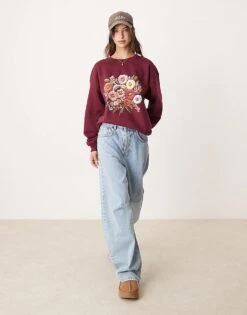 Miss Selfridge Floral Print Oversized Sweatshirt In Burgundy For Women