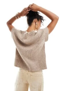 Miss Selfridge Lash Knitted Short Sleeve Top In Mushroom For Women