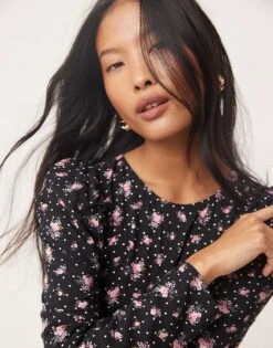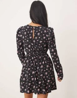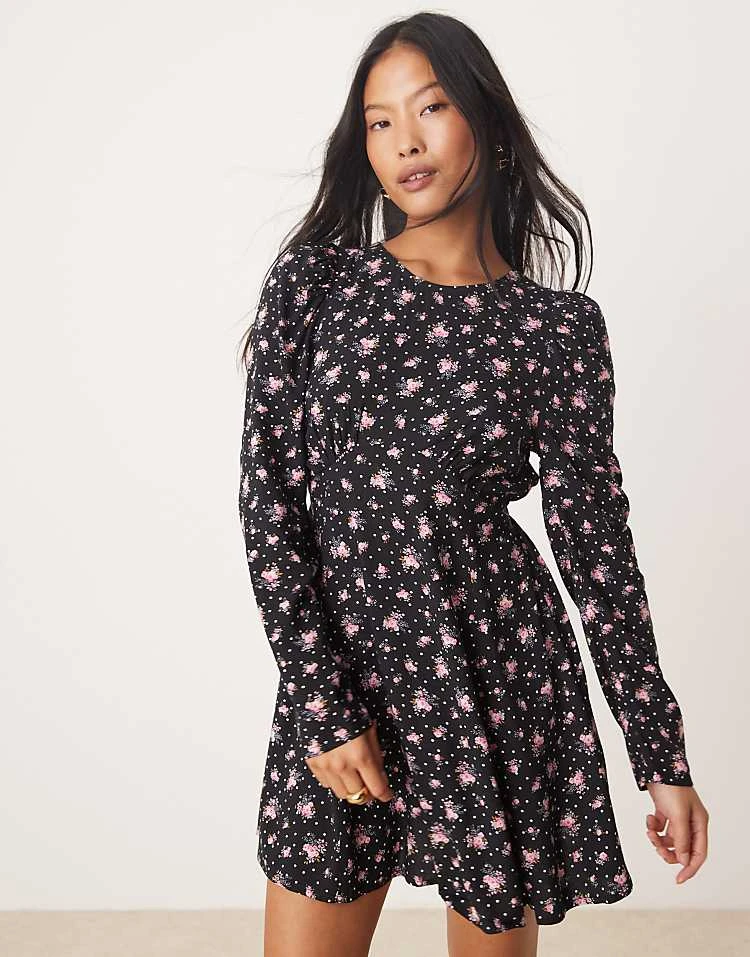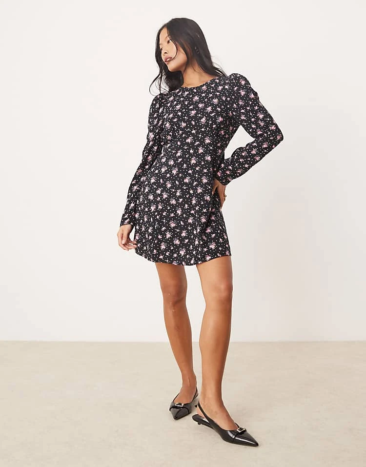 Miss Selfridge Petite Long Sleeve Mini Tea Dress In Ditsy Floral Print For Women Black Floral Print